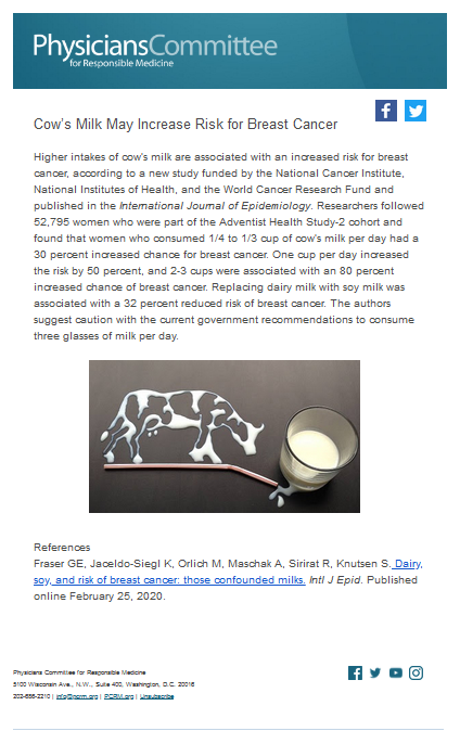 Publicația medicală International Journal of Epidemiology a publicat pe 25 februarie 2020 un nou studiu științific finanțat de Institutul Național al Cancerului, Instutul Național de Sănătate și Fondul Mondial pentru Cercetarea Cancerului din SUA, conform căruia laptele de vacă poate crește riscul de cancer mamar. (Buletin infomativ PCRM, Breaking Medical News din 26 februarie 2020, vezi referințe).