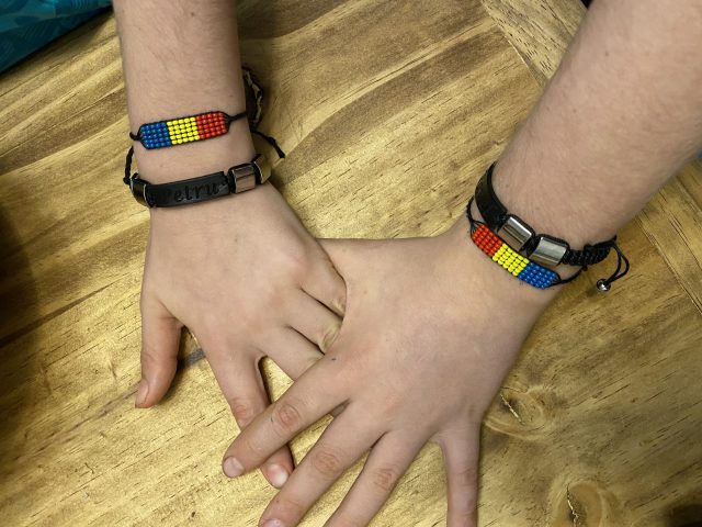 (Later edit 28.01.2022: Brățările cu mărgele și tricolor de la mânuțele celor 2P, le-a adus Călin zilele trecute: ”Soțul unei doamne care te urmărește mi le-a dat, doamna le-a făcut și ți le-a dăruit.” Nu știam cum și cui să-i mulțumesc, căci pe pachețel stătea scris doar atât: ”Cu recunoștință, Alexandrina :)”. Azi am găsit în SPAM un email de la Alexandrina Biriș. Deci ea e cea care a mărgelește modele românești. Le puteți vedea și comanda aici: https://darcudor.ro/. Acum știu cui să multumesc, dragă Alexandrina!💖 💛 💙)