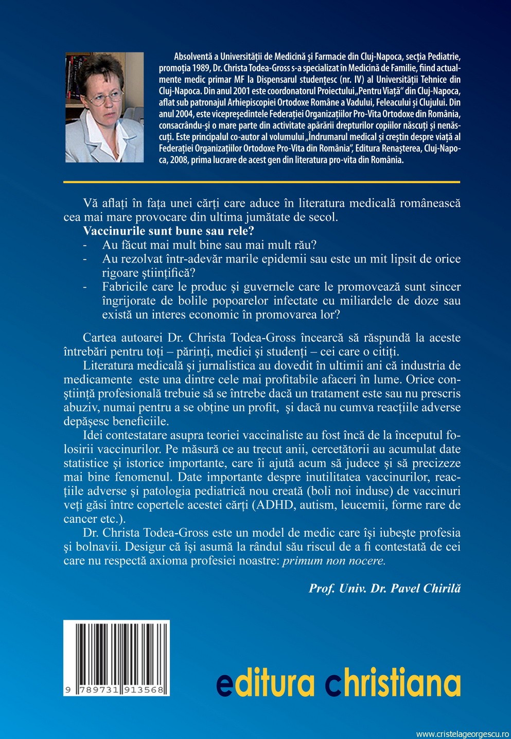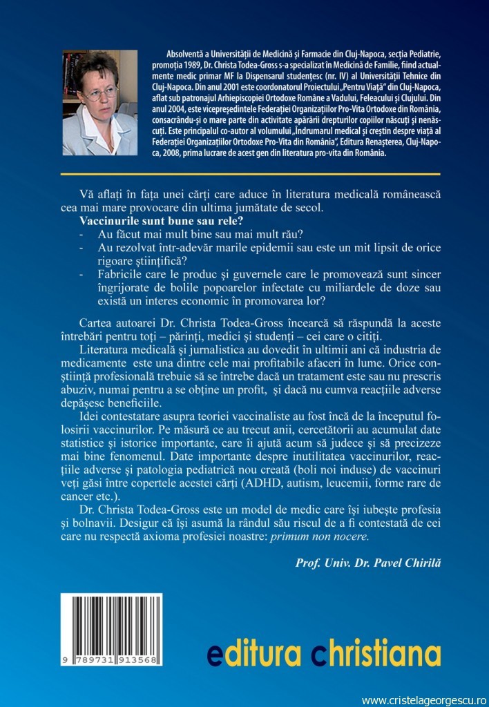 Vaccinurile: preventie sau boala? O noua patologie pediatrica (autor: Dr. Christa Todea – Gross): o carte jertfa, unica in Romania, cu raspunsuri si mult cautate solutii (mai ales de catre parinti), prefatata de Prof. Univ. Dr. Pavel Chirila, aparuta prin grija apostolica a Editurii Christiana din Bucureşti, în colecţia “S.O.S. medical”. De ce unica? In Romania nu exista la ora actuala nicio carte sau studiu in legatura cu cauzalitatea reala dintre numeroasele boli cronice (etichetate de multe ori ca fiind “de cauza necunoscuta” sau genetica) si vaccinurile pretins-“obligatorii” ale sugarului si copilului mic. Exista doar carti care arata beneficiile vaccinurilor si minimalizeaza efectele lor secundare.