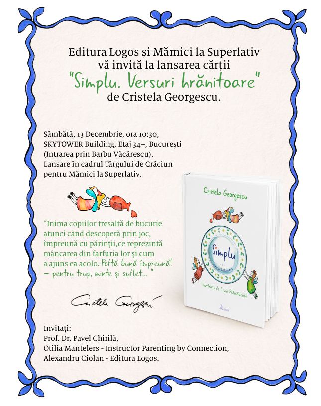 Povestea cărţii urmează la lansare, sâmbătă, 13 decembrie, de la ora 10:30, la Târgul de Crăciun (apropos, programul pentru copii este fantastic!). Pâna atunci vă invit să citiţi o scurtă prezentare pe pagina cărţii si mă pregătesc cu bucurie să vă întâlnesc în Bucureşti, iar de la anul … în ţară! (voi publica intreg programul evenimentelor pentru 2015 pe pagina Evenimente). Pentru copiii acestei lumi şi pentru nemurirea steluţelor din privirea lor.