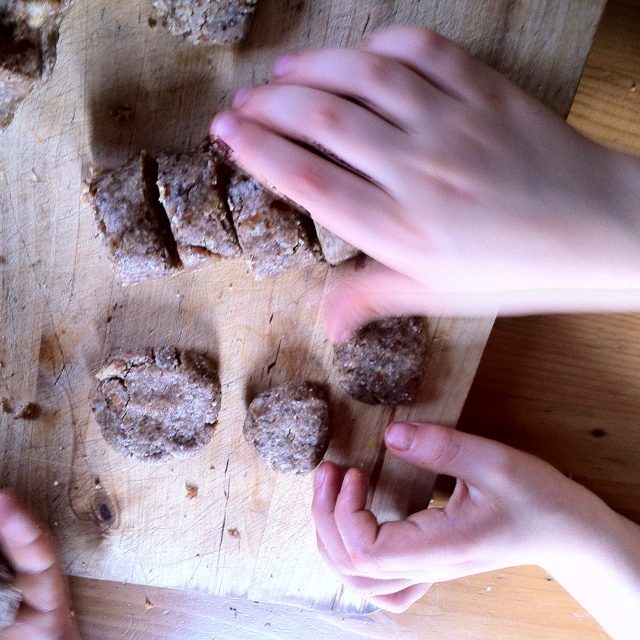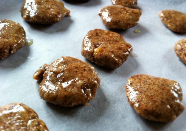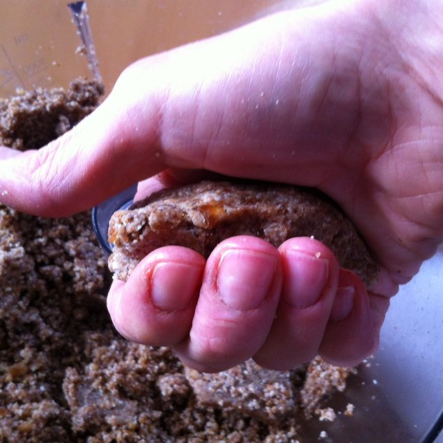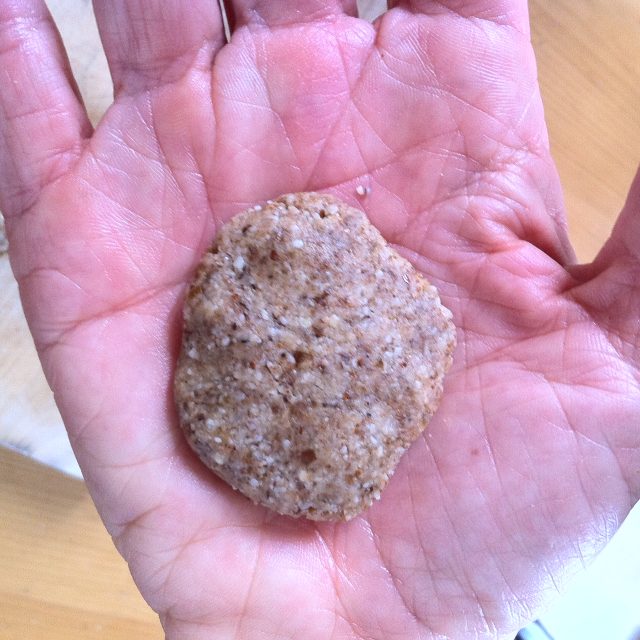 E musai să faceți așa cum vă arăt aici, ca să nu se fărâme și să puteți modela aluatul. Luați o bucată și încălziți aluatul ușor, ca pe “plastilină”. De la căldura palmelor, grăsimea din migdale se topește, curmalele și mierea se lipesc și nu e nevoie de adaosuri, tip ulei de cocos. Am ținut nepărat ca acest desert să NU fie un concentrat de grăsimi, așa cum tind să devină mai toate mâncărurile vegane care imită bucătăria tradițională. Dacă nu ați citit articolul meu despre dulciurile vegane fără foc, apăsați AICI. Promit că nu mușcă și nici nu vă interzice nimic! 🙂