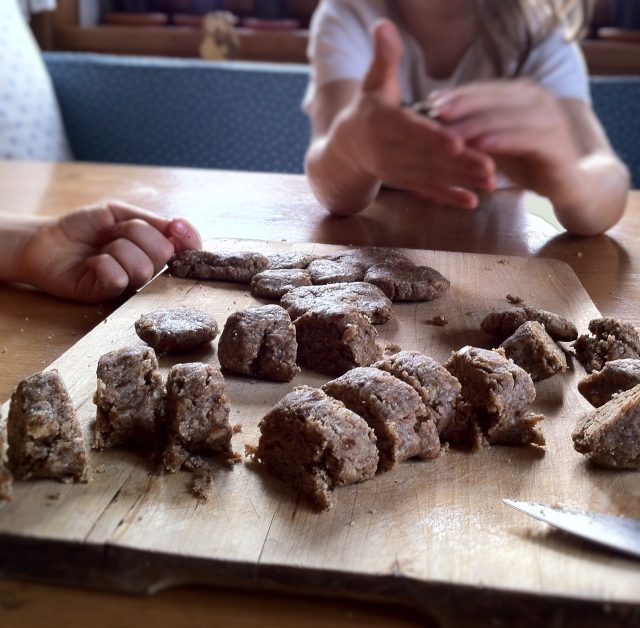 Tai rulourile de aluat (cele care aduceau a mititei) în felioare de 1 cm grosime, să le poată modela ușor și serafimii mei. “Pavel, tu fă o poză, să vadă toate mămicile, iar tu Petru ia-te după mine: strânge ușor între palme de mai multe ori felioara. Căldura mânuțelor tale va face în așa fel încât să se lipească, în timp ce-o presăm și așa n-o să se fărâmițeze!” Procedați întocmai, vă spun din ce-am văzut practic că dă rezultate.