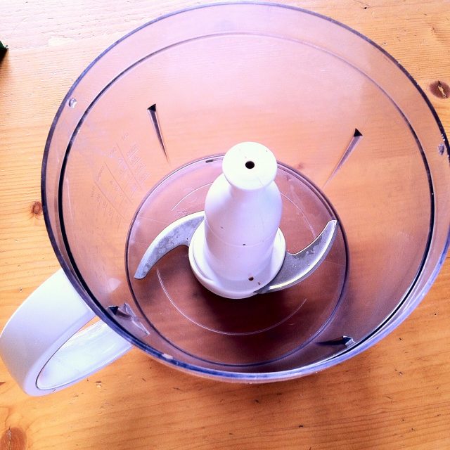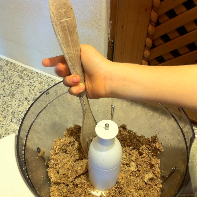 Se macină totul mărunt. E așa important să facem turta asta ACUM, că băieții nici nu acceptă să-și schimbe pijamalele până nu e gata!