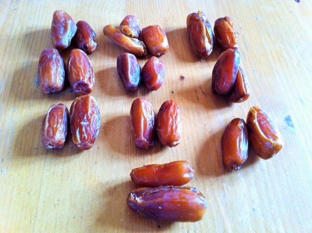 20 de curmale fără sâmburi (orice fel de curmale, le prefer totuși pe cele Medjoul, sunt ca niște caramele și lipesc foarte bine)